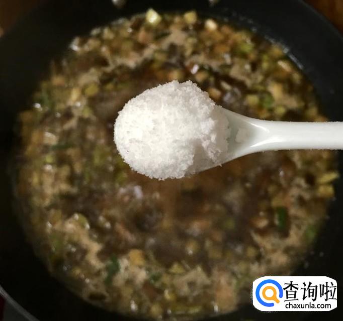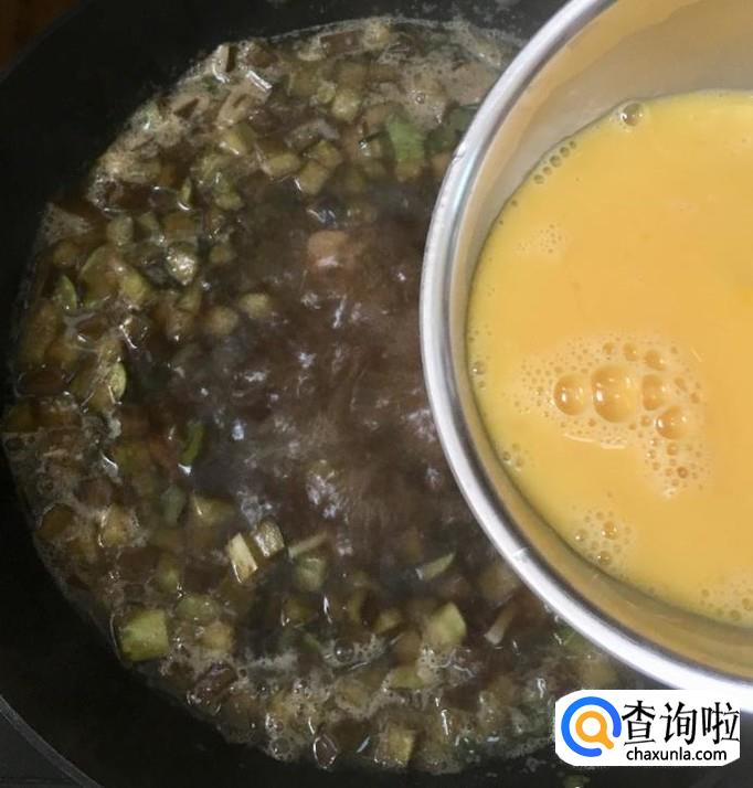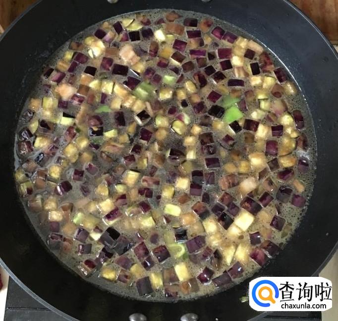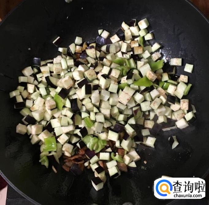 倒入茄子和青椒丁翻炒均匀使其吃透油脂并变色