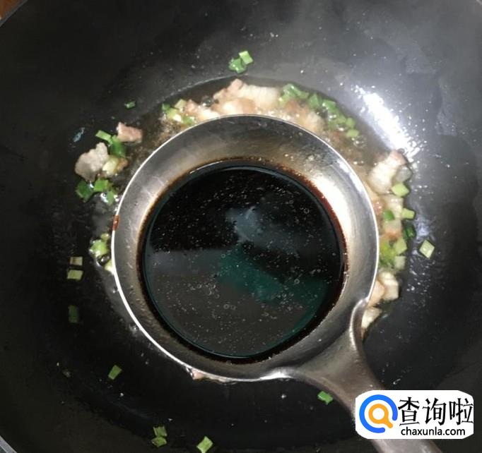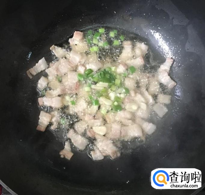 热锅加入多一点的花生油放入五花肉片炒香,放入葱花、蒜片爆香后烹入料酒和生抽