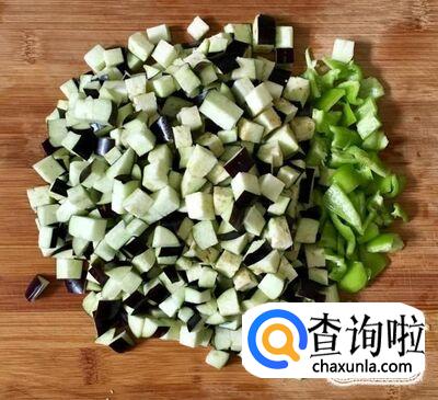 茄子、青椒择去蒂清洗干净并沥干水分后分别切成小丁备用
