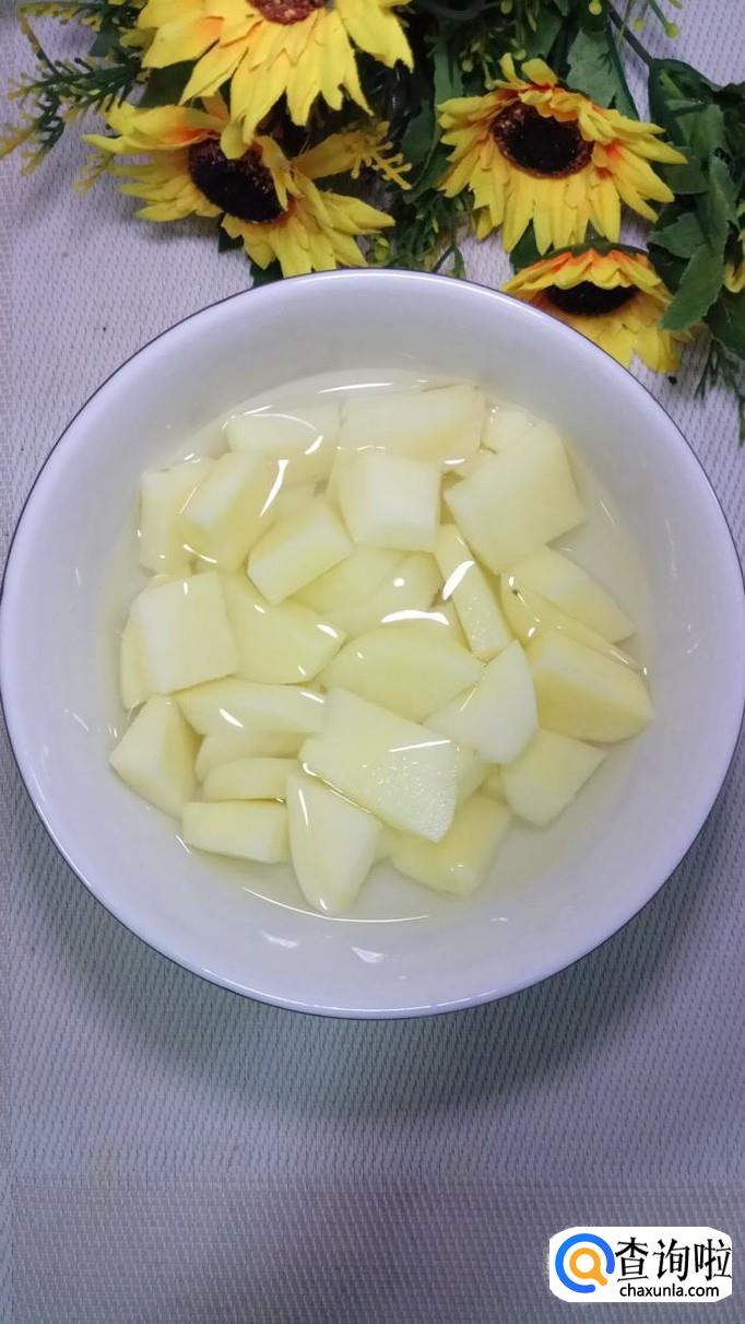将土豆去皮后,切成小块,用清水洗去淀粉;将老豆腐切成方块;再将火腿肠去除外衣,切成小块,放入盘中备用。