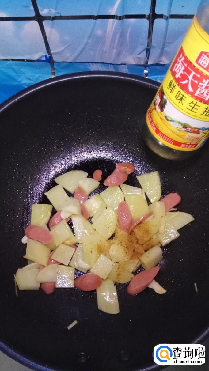 将香肠放入锅中,和土豆一起翻炒均匀。