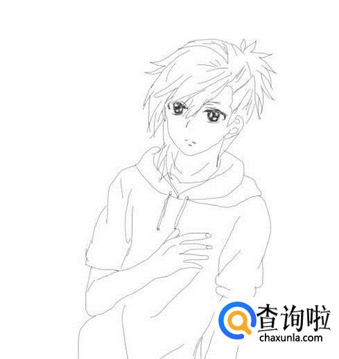 再画出男生的肩膀,然后再画出身体并在身体上画出男生的胳膊及手部,这样帅气的动漫男生就画好了,如图所示: