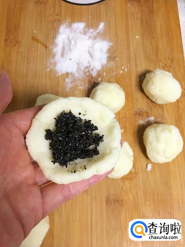 取其中一个小段,揉圆后压扁,包入适量芝麻馅。