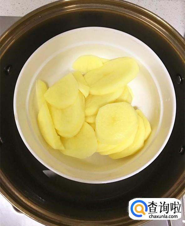 土豆片放入盘中,送入蒸锅,水开后转中小火5-6分钟,当筷子能轻易戳过土豆片就可以出锅了。