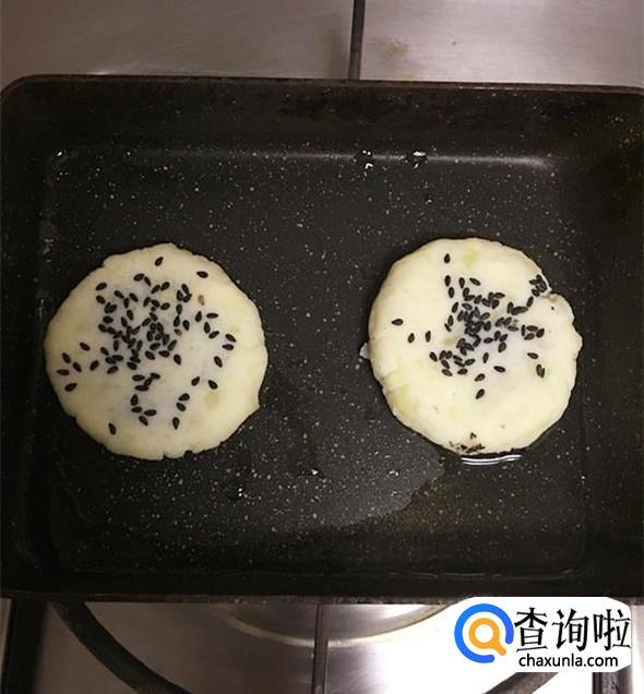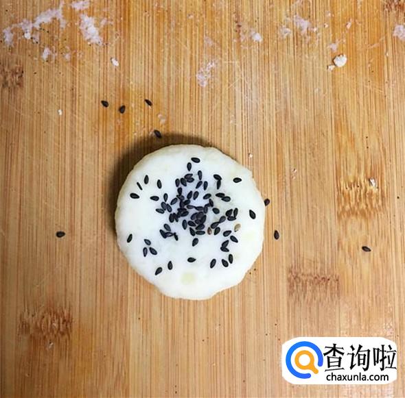 包好后封口朝下,压扁,并在上面撒上少许芝麻,用手掌轻轻按压。