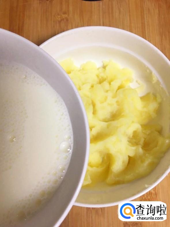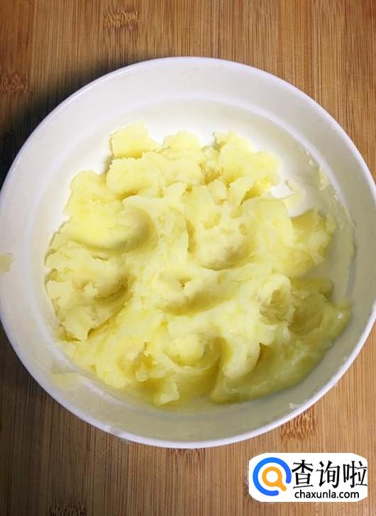 蒸熟的土豆片稍微晾凉,然后用勺子压成土豆泥。