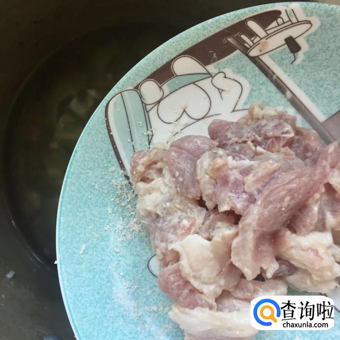 接着把瘦肉切成薄片并用适量的地瓜粉裹一下,如下图所示。瘦肉片用地瓜粉裹一下,煮熟后的瘦肉会更加鲜嫩而且不塞牙。