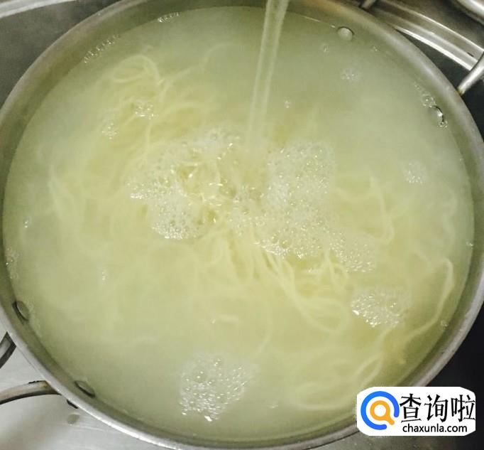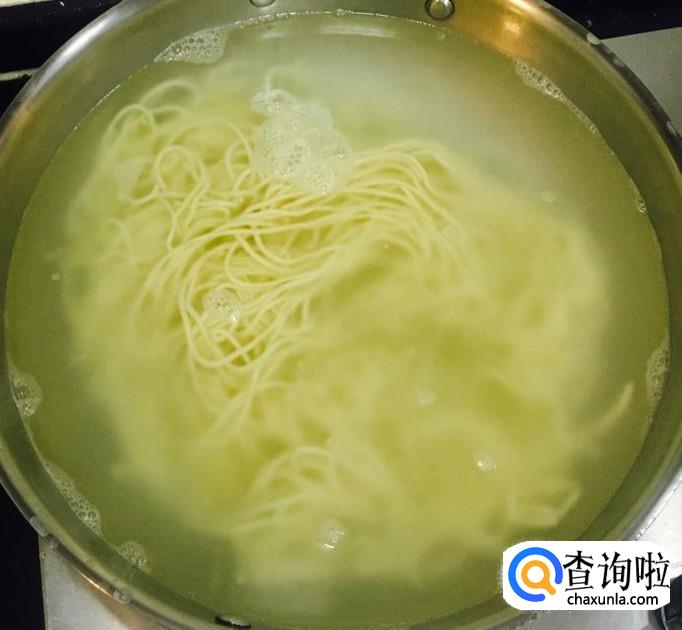 锅中加水煮沸下入面条煮至适合自己的的软硬程度关火,根据自己的喜好过一下凉水