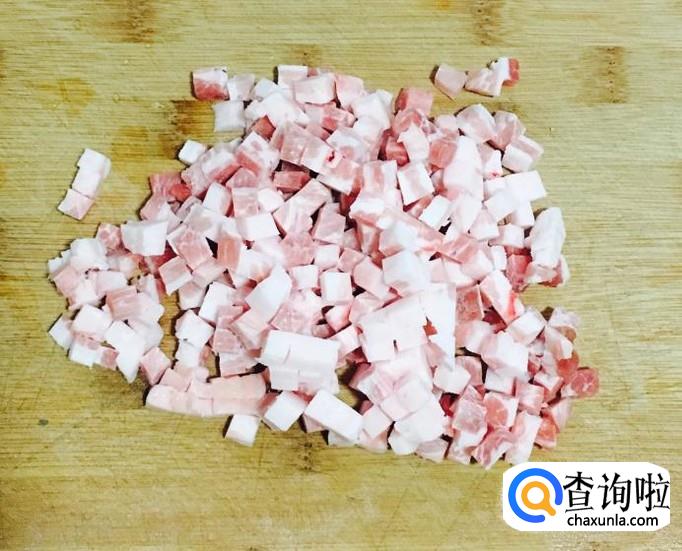 大葱剥去外皮清洗干净切成葱花,五花肉一块用温水冲洗干净后切成小肉丁备用