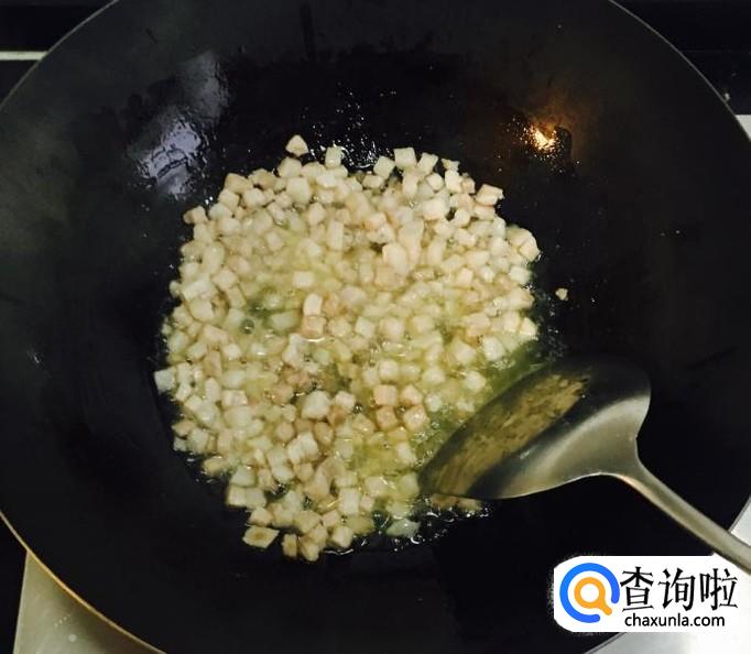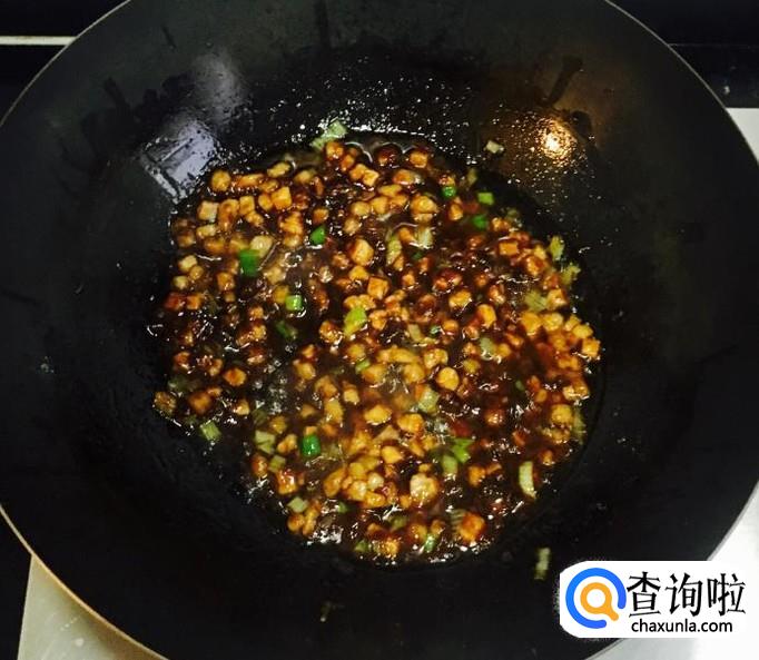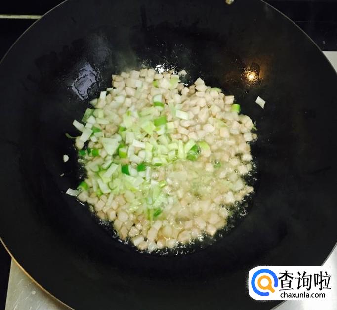 锅中加入适量的花生油放入肉丁炒香并出油后放入葱花爆香,料酒烹锅
