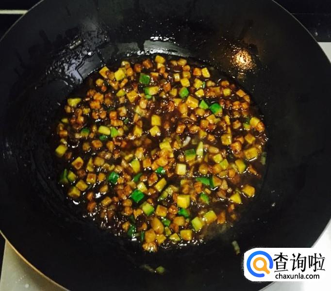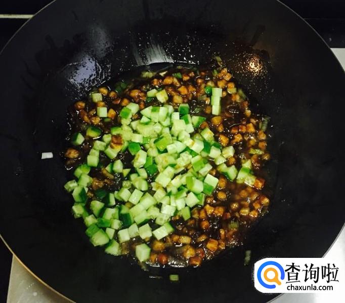 最后放入黄瓜丁再次翻炒均匀,如果太粘稠出锅前可以加点味极鲜酱油