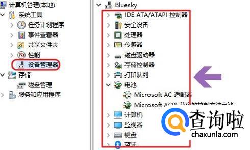 接着在弹出的计算机管理对话框,我们点击左侧的“设备管理器”,然后在右侧界面中双击任意硬件设备了,即可看到相对于的配置情况了见图二;