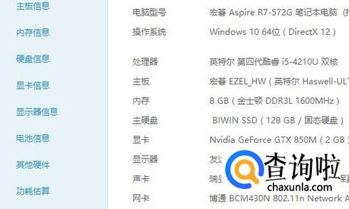 如上图所示,点击上方工具栏的“硬件检测”,系统就会将电脑的配置信息全部展现出来,而且相比较第一种方法,这里很多人都能看得懂配置信息;