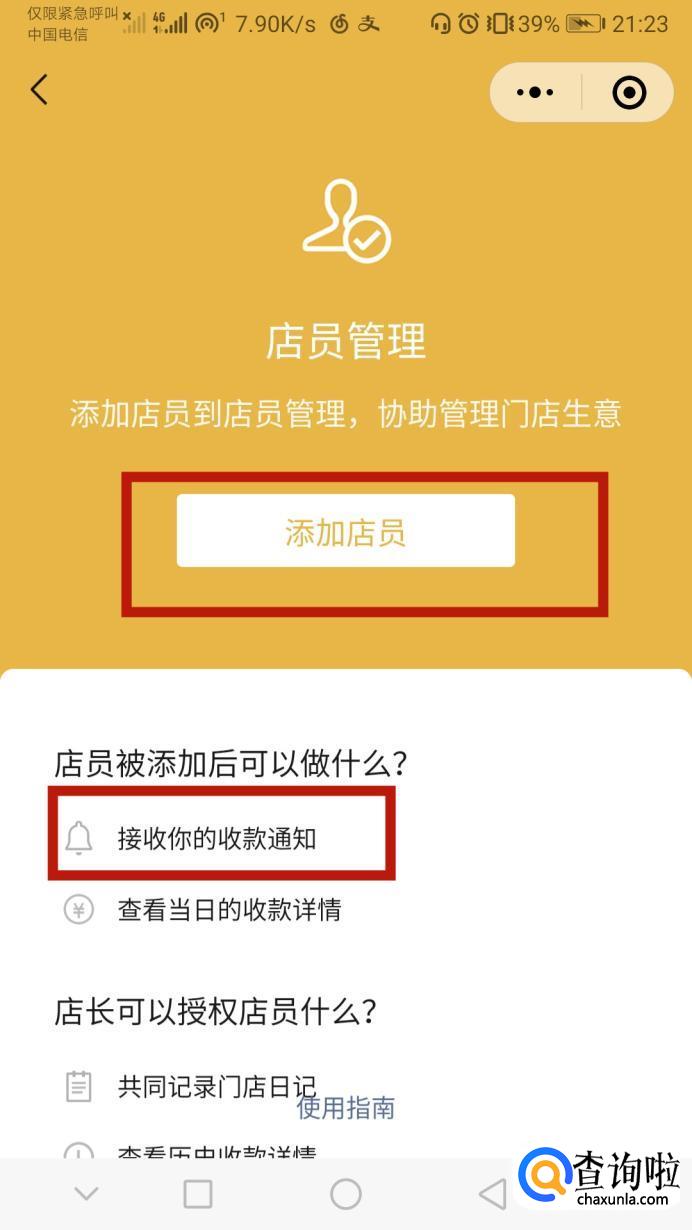 点击门店日志后,我们可以看到店员管理,如图所示,添加店员可以让添加的店员一起接受整个店铺的收款通知,我们点击添加店员。