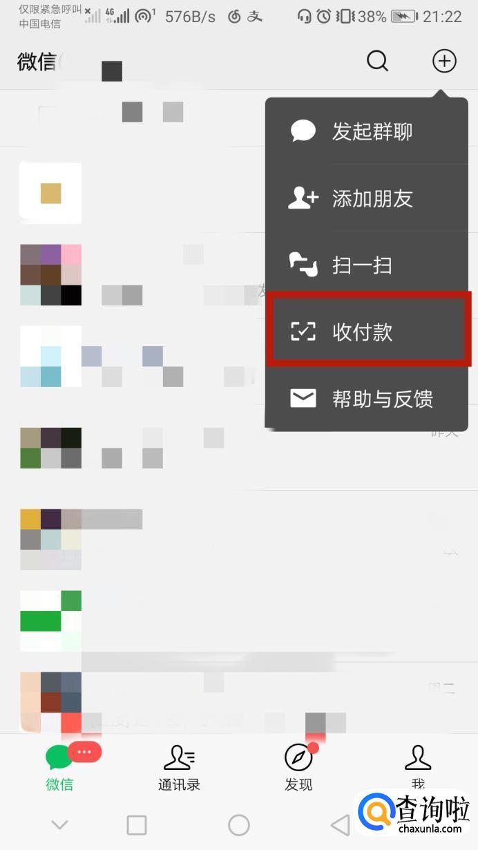 首先打开手机微信,点开右上角的箭头,点击收付款。