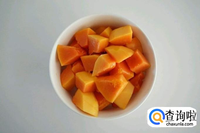 将木瓜去皮,切成对半,掏出肚子里的籽,然后将木瓜清洗干净,再切成3cm大小的块状,备用。