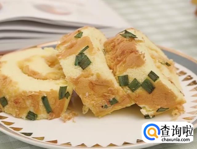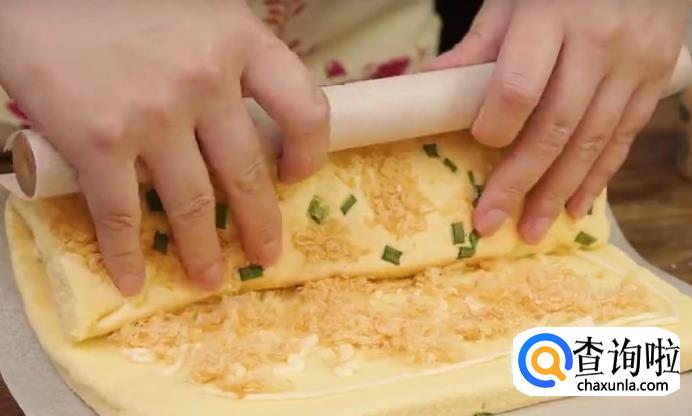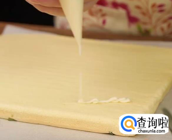 取出烘烤好的蛋糕,挤上沙拉酱撒点肉松,借助擀面杖卷起定型2半个小时即可切块。