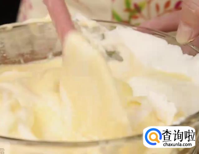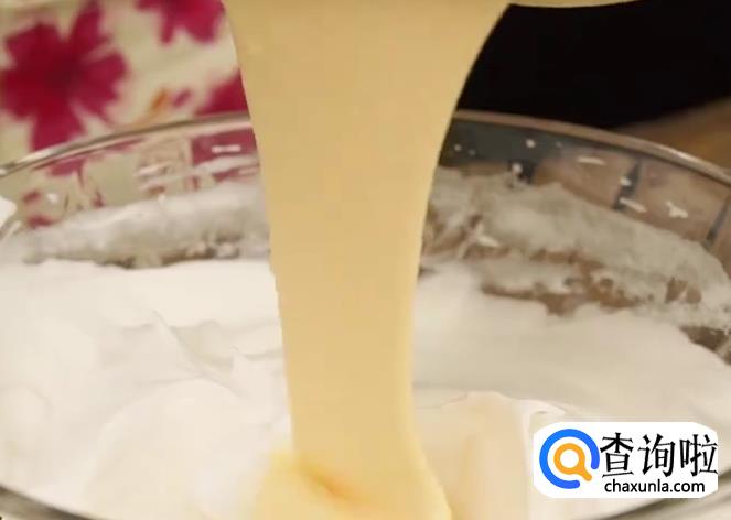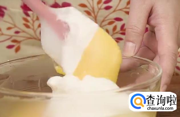 取三分之一蛋白霜加入蛋黄糊中搅匀,再倒回剩余的蛋白霜中搅匀。