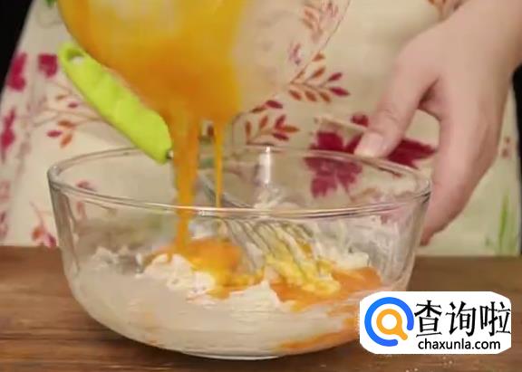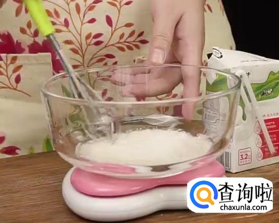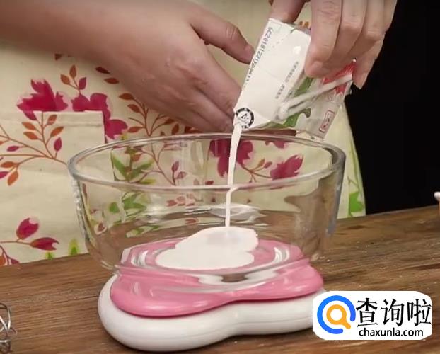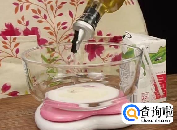 首先将蛋清分离,将50克牛奶和45克玉米油搅拌乳化。
