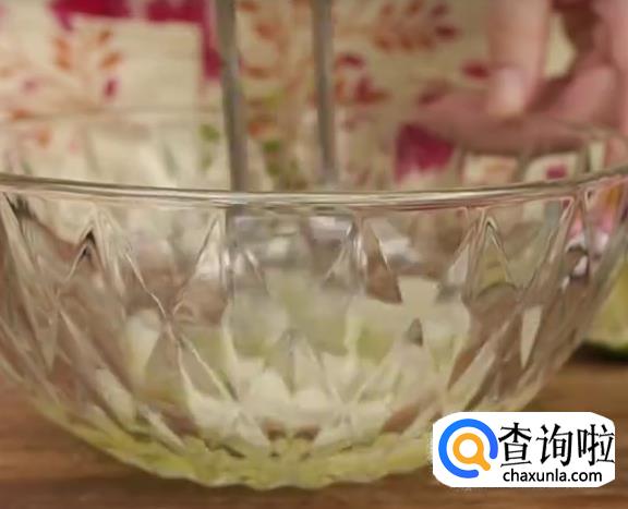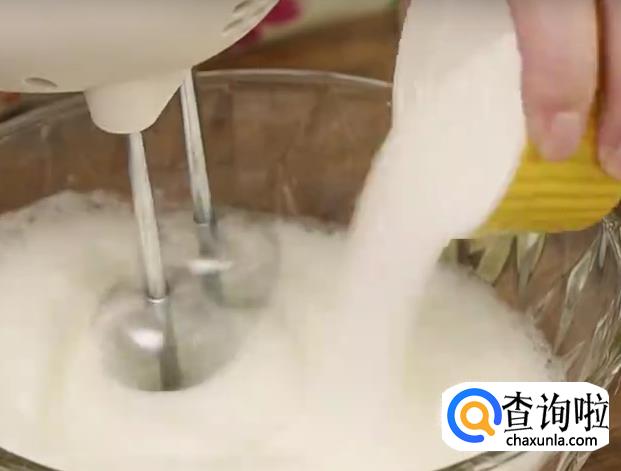 蛋清中放入1克盐和几滴柠檬汁打至粗泡。再将65克白砂糖分三次加入打发。