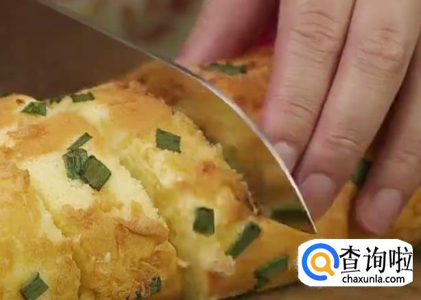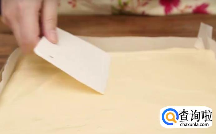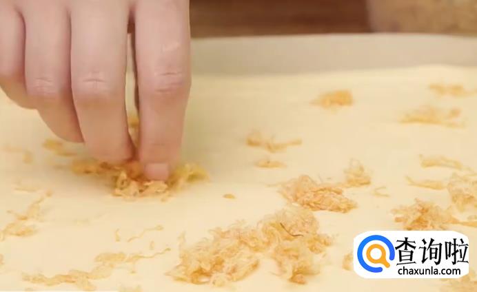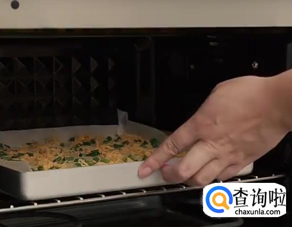 倒进烤盘中刮平,撒上肉松和葱花,放入预热好的烤箱175度烤20分钟。