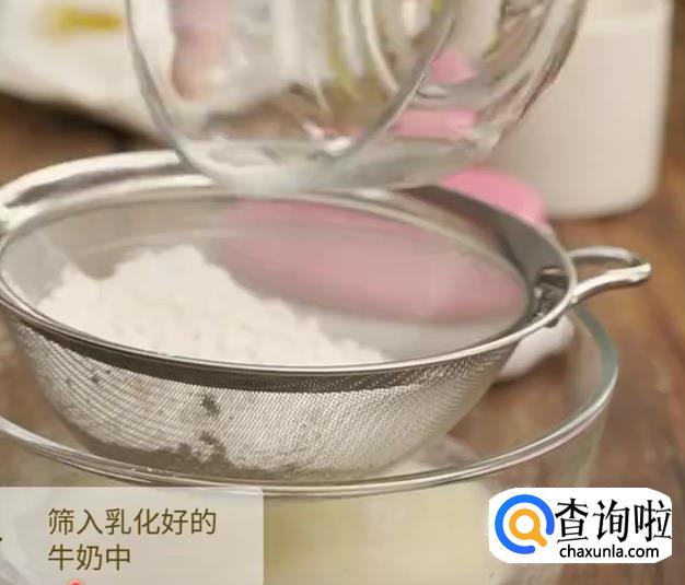 称出85克低筋面粉和7克玉米淀粉,筛入乳化好的牛奶种搅拌,搅匀后导入蛋黄继续搅匀。