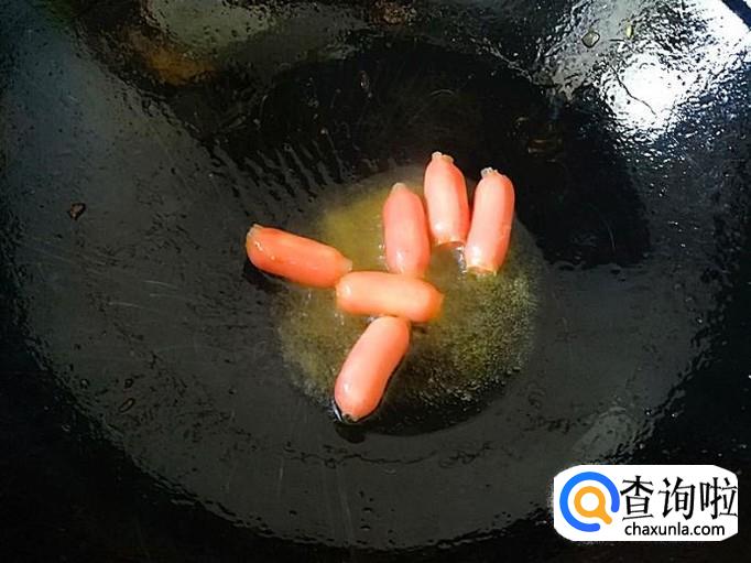 炒锅里加入适量的植物油烧到7成热,加入适量的小火腿肠炒1分钟,快速放入洋葱继续炒片刻。