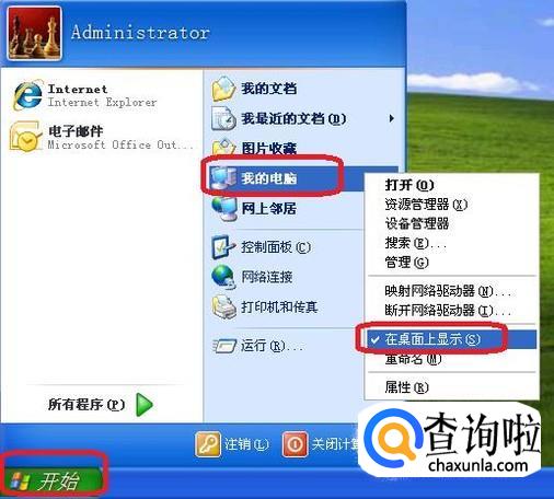 首先,最简单的办法就是点击开始菜单,如图所示,右键点击菜单中“我的电脑”,然后在弹出菜单中勾选“在桌面上显示”,就可以解决这一问题。