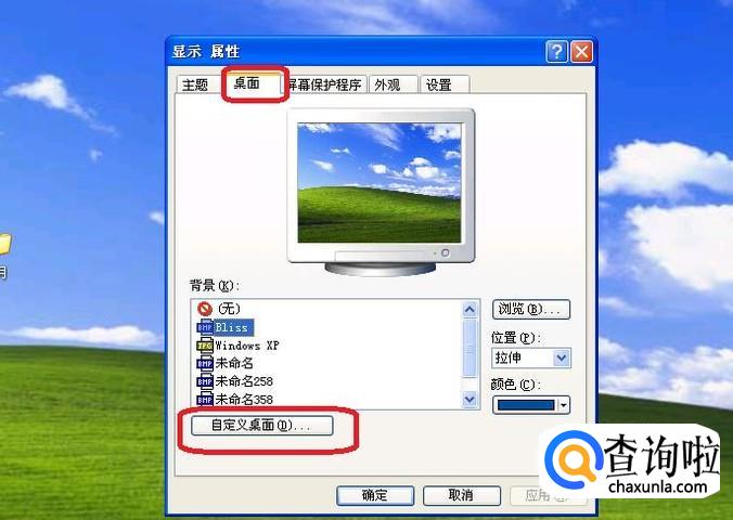 弹出“属性”面板,我们点击面板中的“桌面”标签,然后点击里面的“自定义桌面”按钮。