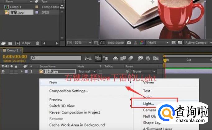 接下来我们右键单击背景层,在弹出的菜单中选择New下面的Light选项,如下图所示