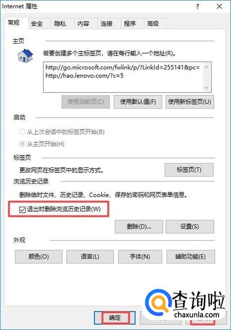 弹出的界面,我们将退出时删除浏览历史记录给勾选上,之后点击应用,然后点击确定,这样就可以了。