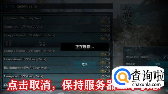 登陆游戏进去后,咱们就可以选择对应的服务器登陆了,如果一直卡在正在连接的话!点击取消,保持服务器列表显示的状态,然后去退出科学上网,再进去方舟,重新选择服务器加入就可以了!赶紧去尝试一下吧。