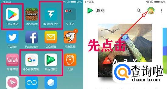 点击play商店,确定你已经登录上去了谷歌,然后打开paly 游戏,也就是我们俗称的goole play game。一定要确定你有登陆上去谷歌商城,如果有的话,进入play 游戏右上角是可以看得到你的信息的,如果没有,请登陆!