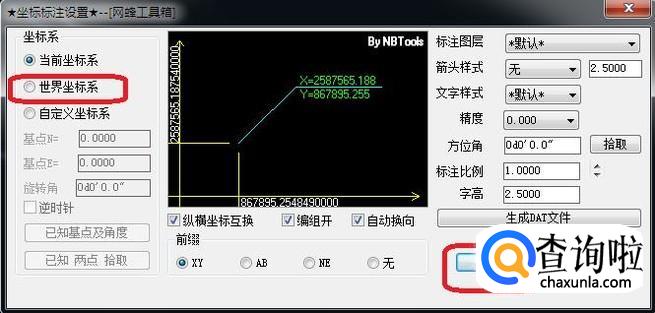 在“坐标标注设置”面板中,选择坐标系为“世界坐标系”,点击确定。
