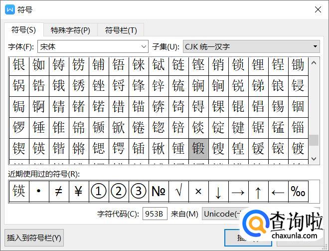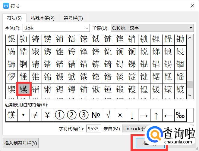 接下来我们只需要在里面找到【锳】字,点击右下角的【插入】即可。