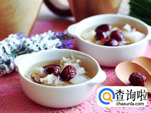 将银耳事先泡发,务必剪去黄色硬蒂。银耳、雪梨、红枣分别切小块,随冰糖一起放入锅内,高火煮开,煮至冰糖彻底融化,盛入碗内冷却之后即可食用。这道银耳雪梨糖水可谓十分滋润,对长期咽炎、喉咙干痛或是长期使用嗓子的人很有好处。