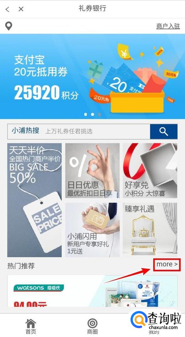 在礼券银行页面,点击“热门推荐”后方的“more”或者直接在搜索框搜索;