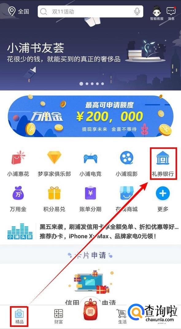 打开浦大喜奔APP先登录,在“精品”首页找到“礼券银行”,没有的话,就在更多里查找;
