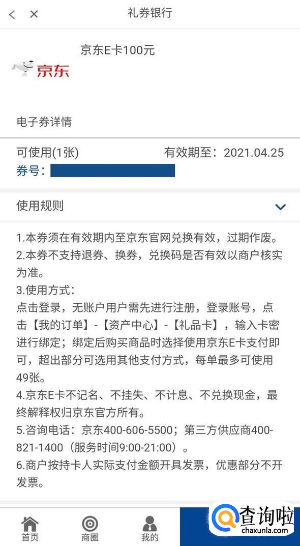 购买成功以后,就可以看到券号了,凭此券号可在京东商城使用,抵扣对应金额,如果暂时不需要该券也可点击退款退掉;