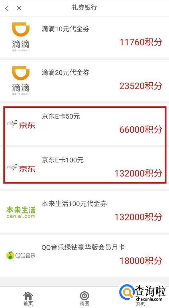 在代金券列表中找到“京东E卡”,有50和100两种面值,根据自己积分选择需要的京东E卡;