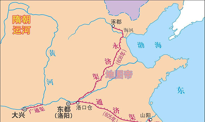 隋炀帝时,发河南淮北诸郡民众,开掘了名为通济渠的大运河。自洛阳西苑引谷、洛二水入黄河,经黄河入汴水,通济渠,始建于隋朝,为区分“古汴渠(汳水)”,隋朝之后又称其为“汴河”,是隋唐大运河的首期工程。亦是京杭大运河的第二个时期。这个时期的运河以东都洛阳为中心,于大业元年(605)开凿通济渠,直接沟通黄河与淮河的交通。并改造邗沟和江南运河。三年又开凿永济渠,北通涿郡。连同公元584年开凿的广通渠,形成多枝形运河系统。