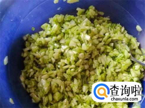 做丝瓜馅饺子好用嫩丝瓜,丝瓜清洗干净之后切片,然后用刀剁碎,挤去水分待用。
