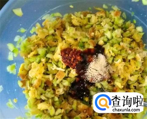 丝瓜和放凉后的鸡蛋碎放在一起,加入一点食盐,加上葱姜末,加入一点点味素(可以不加),倒一点蚝油搅拌均匀,饺子馅做好了。