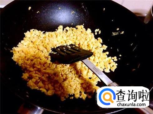 锅里到油烧热,打进碗里几个鸡蛋打散,直接倒进锅里做成鸡蛋碎。
