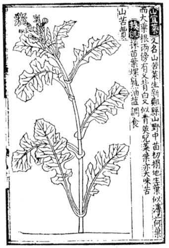 《救荒本草》明永乐四年(公元1406年)刊刻于开封,是一部专讲地方性植物并结合食用方面以救荒为主的植物志。全书分上、下两卷。记载植物414种,每种都配有精美的木刻插图。其中出自历代本草的有138种,新增276种。从分类上分为:草类245种、木类80种、米谷类20种、果类23种、菜类46种,按部编目。