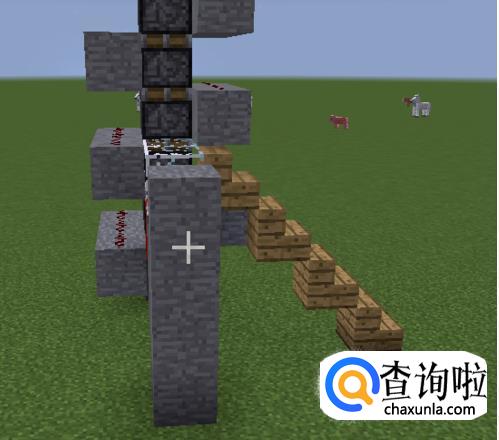红石块上方放一个玻璃,玻璃的一侧再放一个玻璃。右侧放一排向上的楼梯,保证玩家通过楼梯可以到玻璃上面。