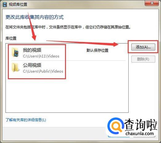 在弹出“视频库位置”对话框中我们能看到有两个保存位置都是C盘,点击右边的“添加”按钮。