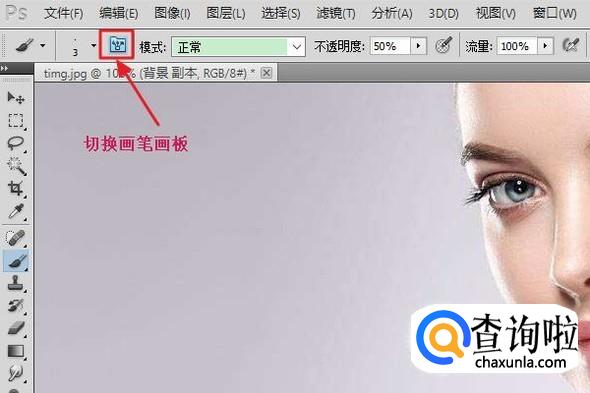 不过不论是仿制印章工具还是涂抹工具,都会对眼睫毛的部分造成影响,为了使闭合时的效果更佳逼真,我们选择“画笔工具”,然后点击画笔对应上方的“切换画笔工具”