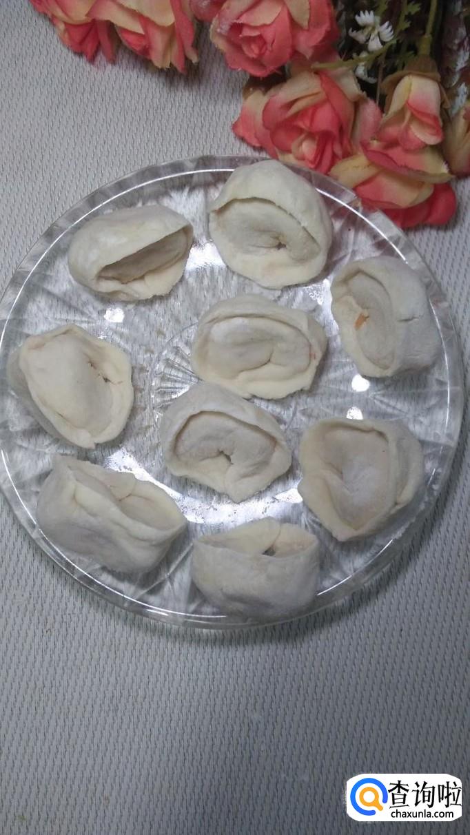 将做好的胡萝卜肉馅放在饺子皮上,用手捏成草帽状,放入盘中备用。