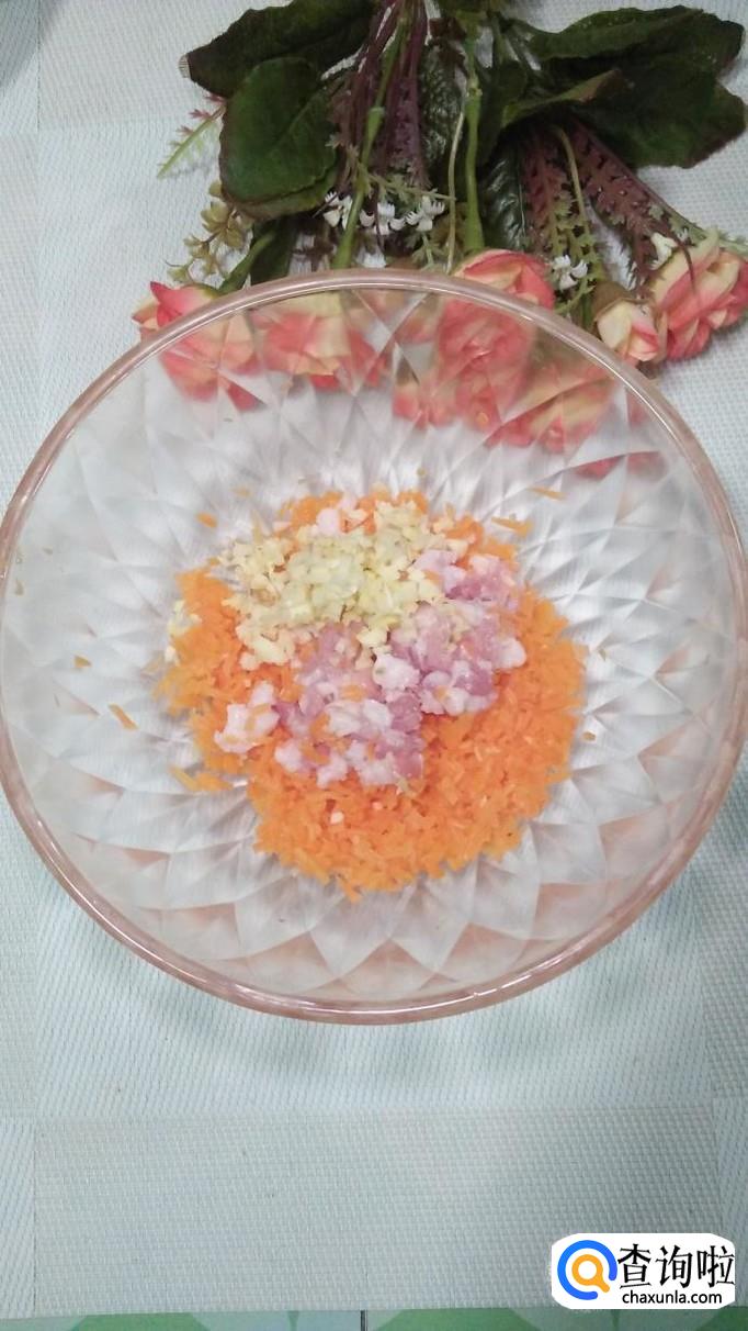 将焯过水的胡萝卜切碎,放入五花肉碎。